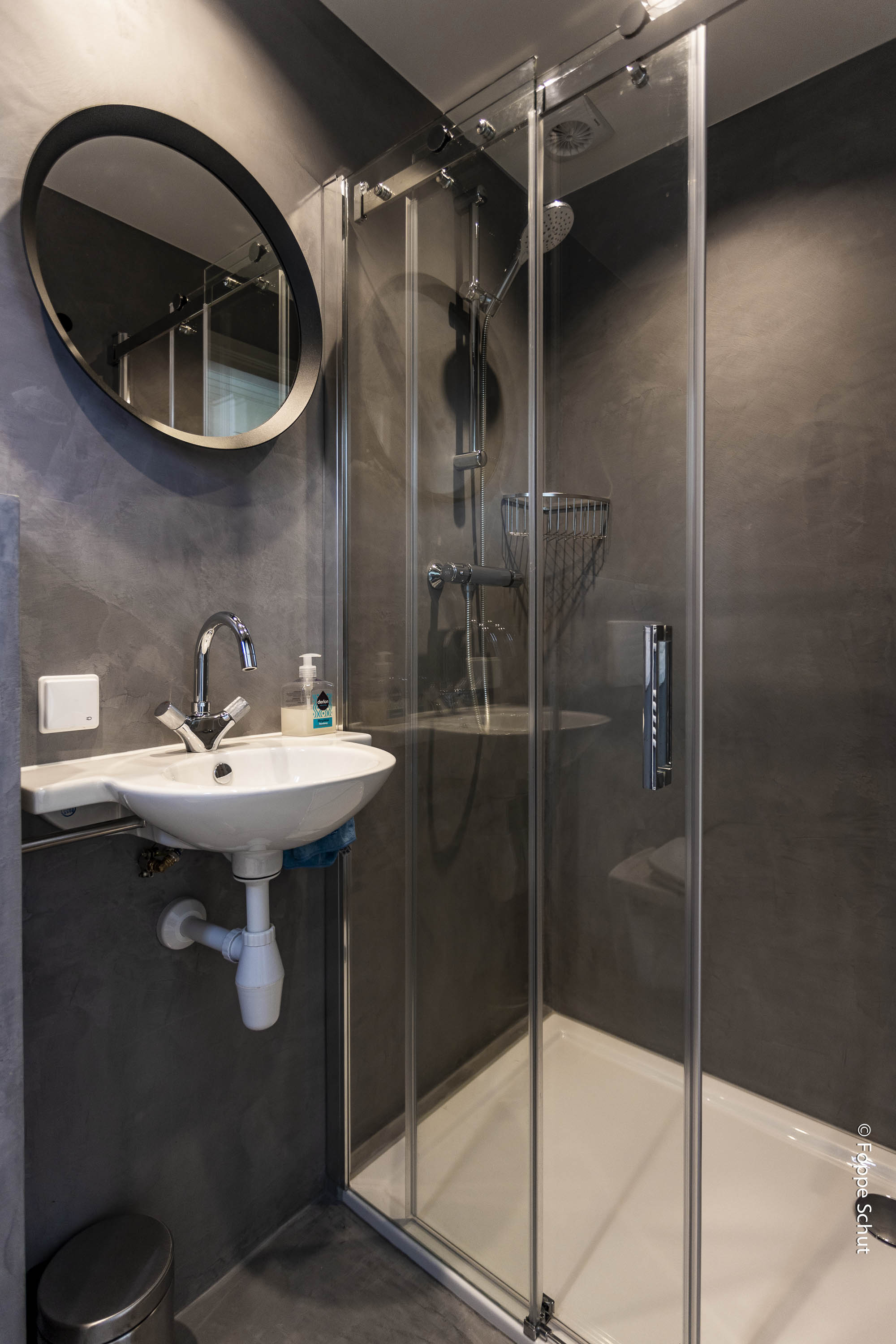 een badkamer met douche met toilet