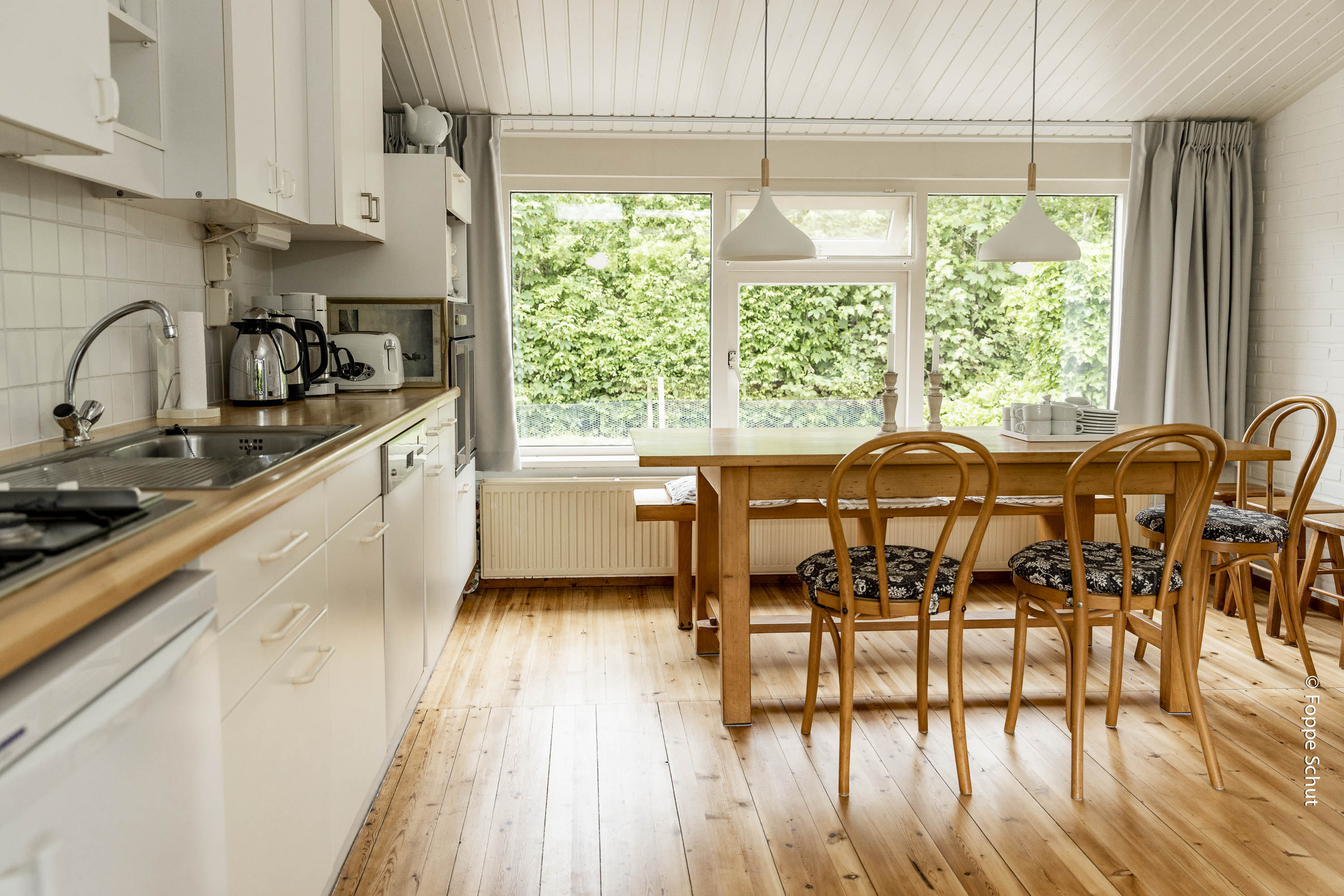 een woonkamer met tweezits bank en twee fauteuils en een goed uitgeruste open keuken met oven, magnetron, afwasmachine, een lange ruime eettafel.
