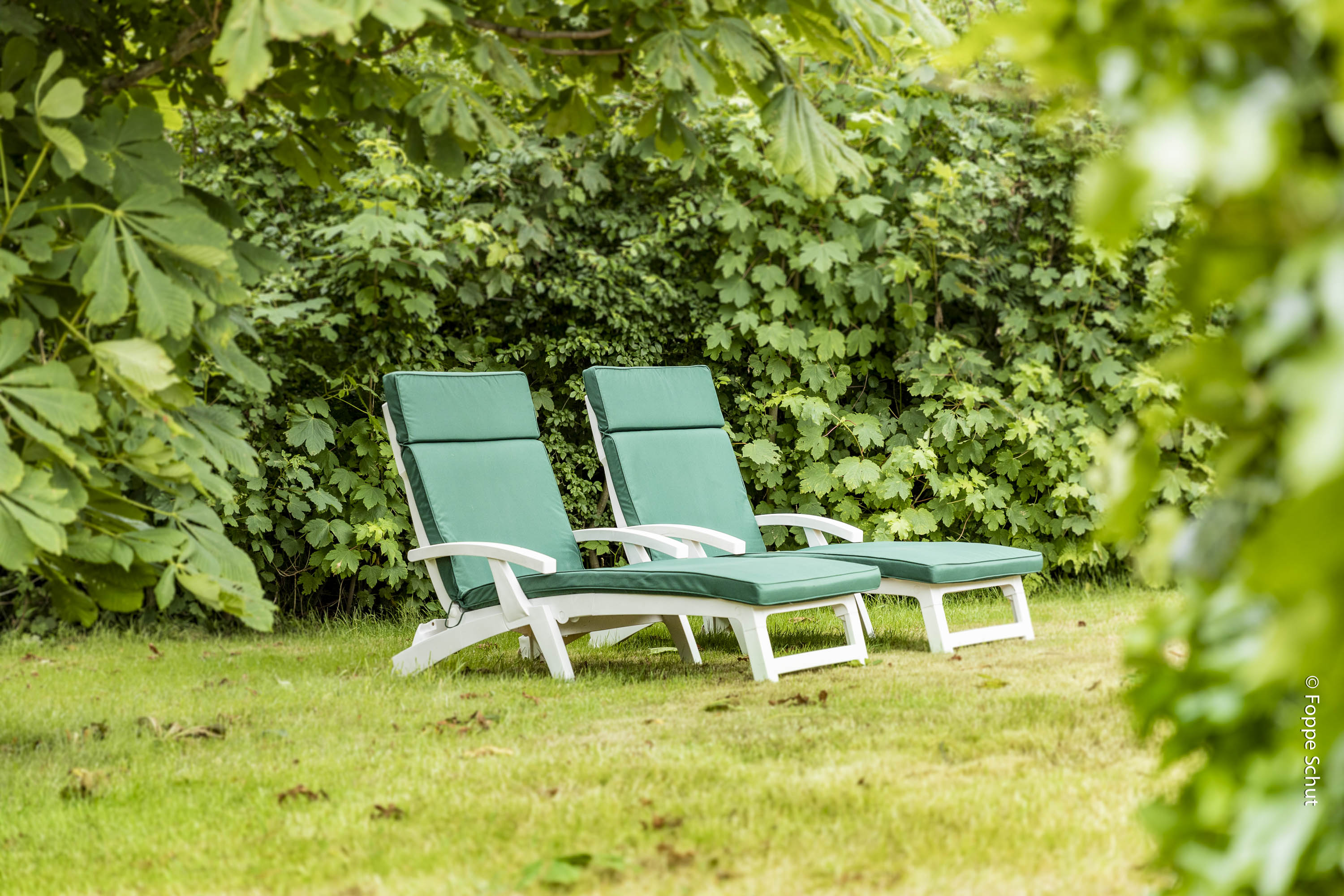 6 ligstoelen en 2 ligbedden met kussens,