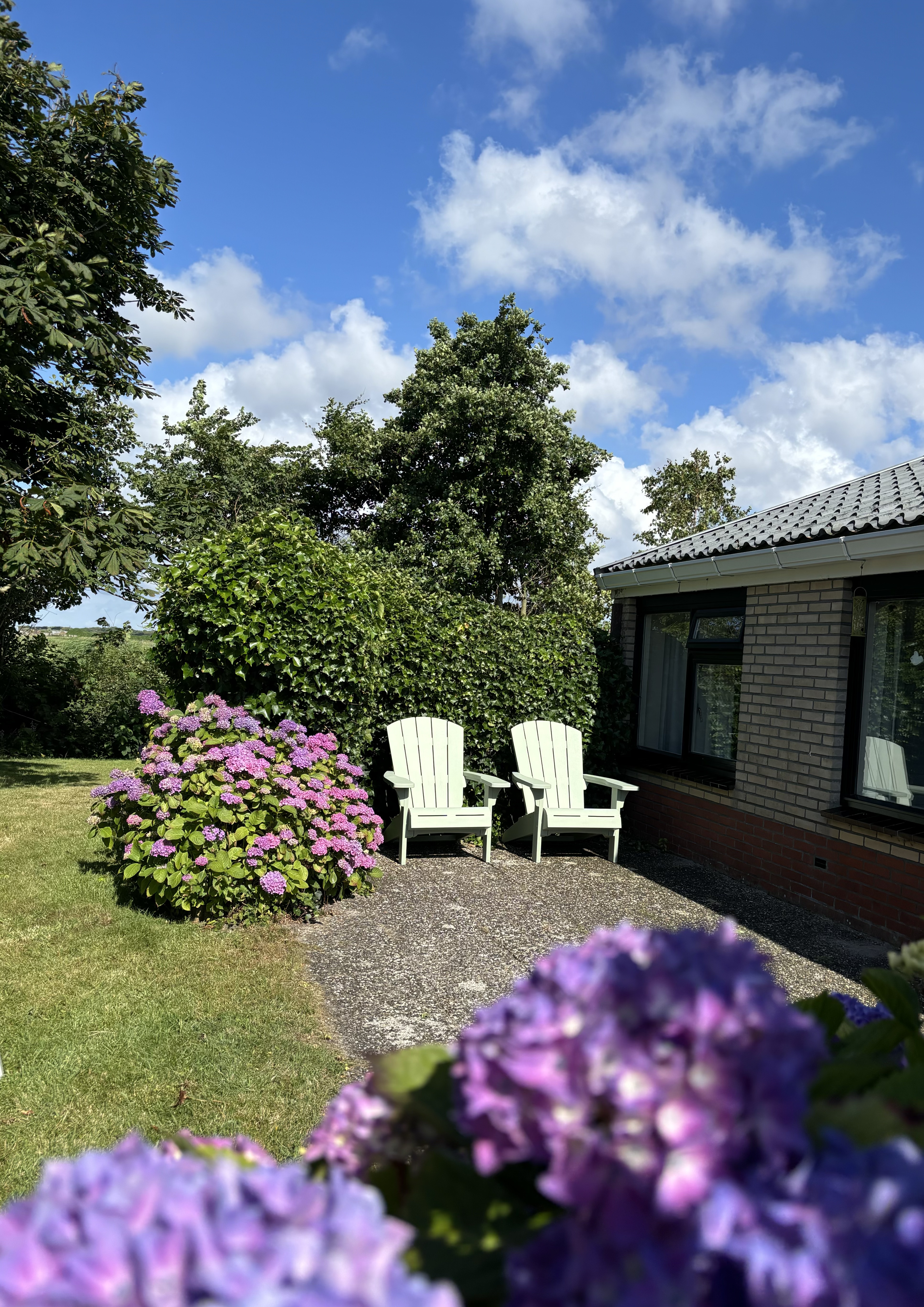 twee zonnige terrassen (op het zuiden en noorden) een met een tafel en zes stoelen en een met een zithoek, en een ruime tuin rondom het huis met veel privacy